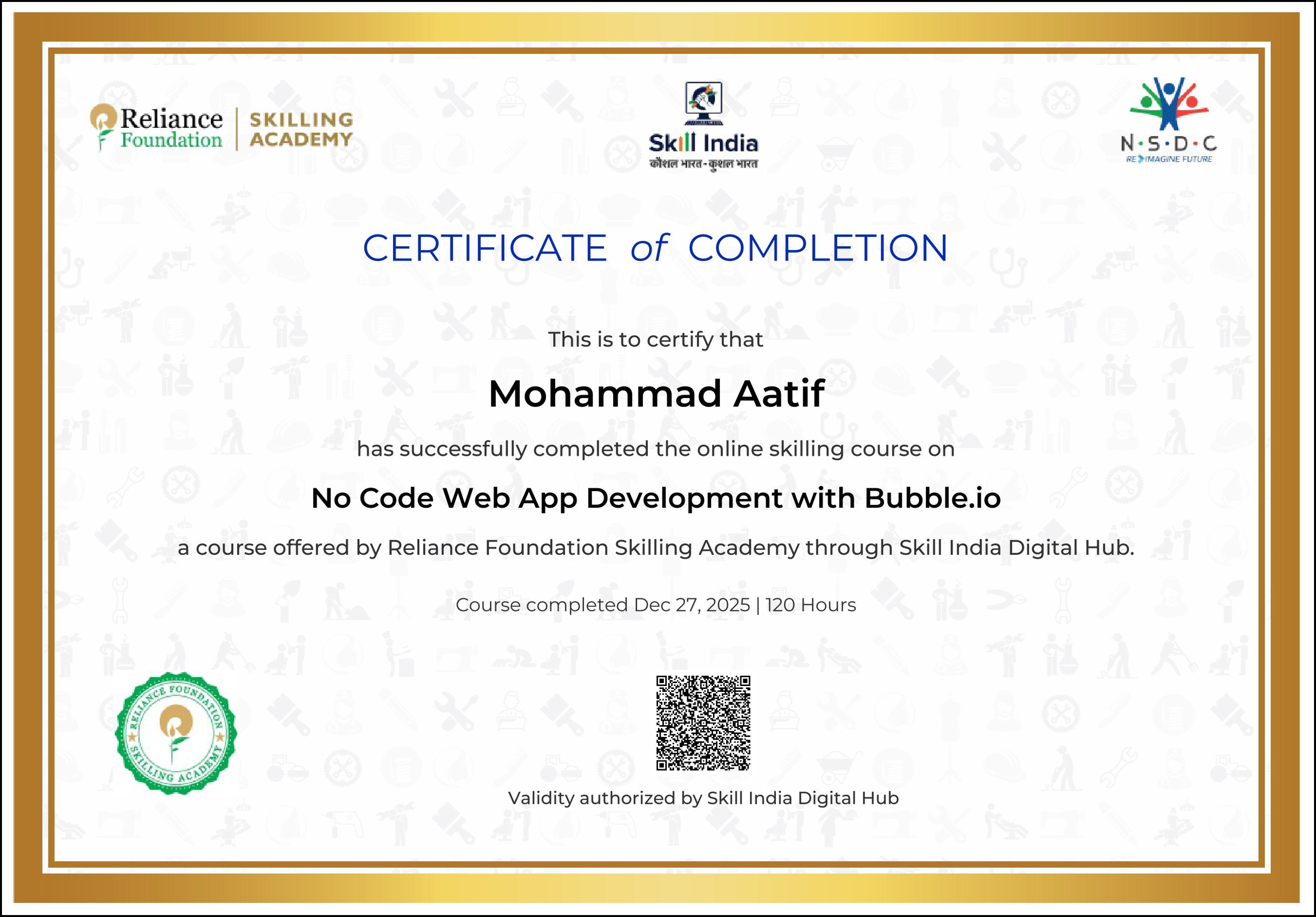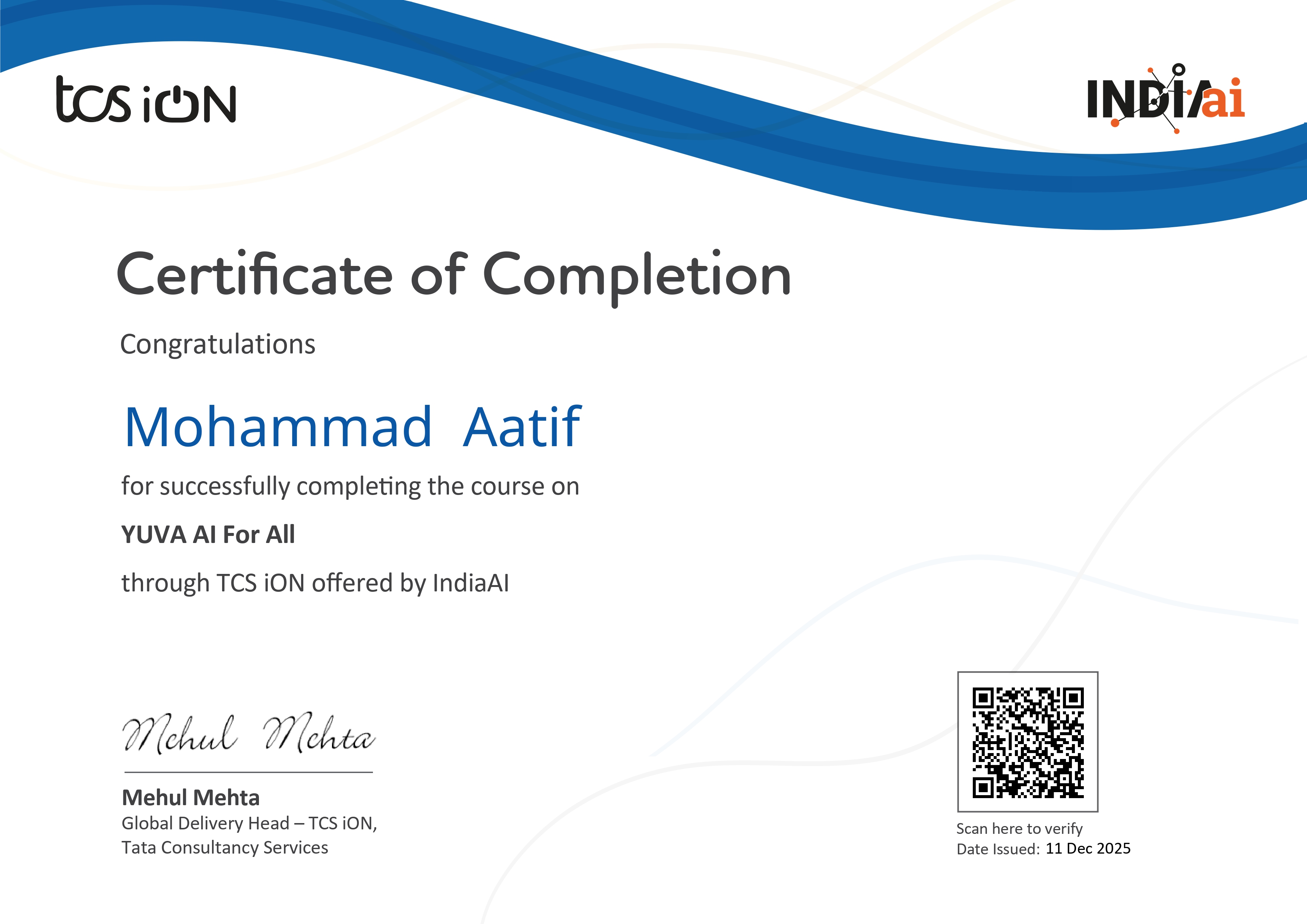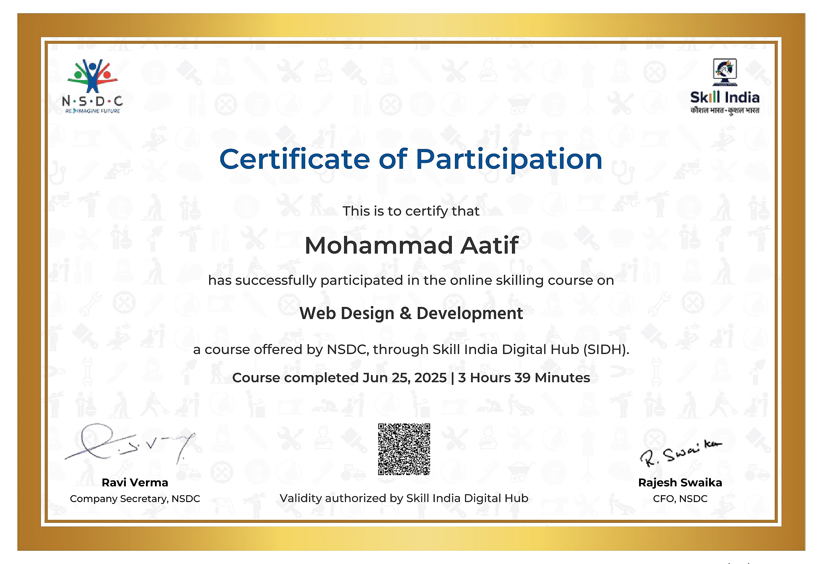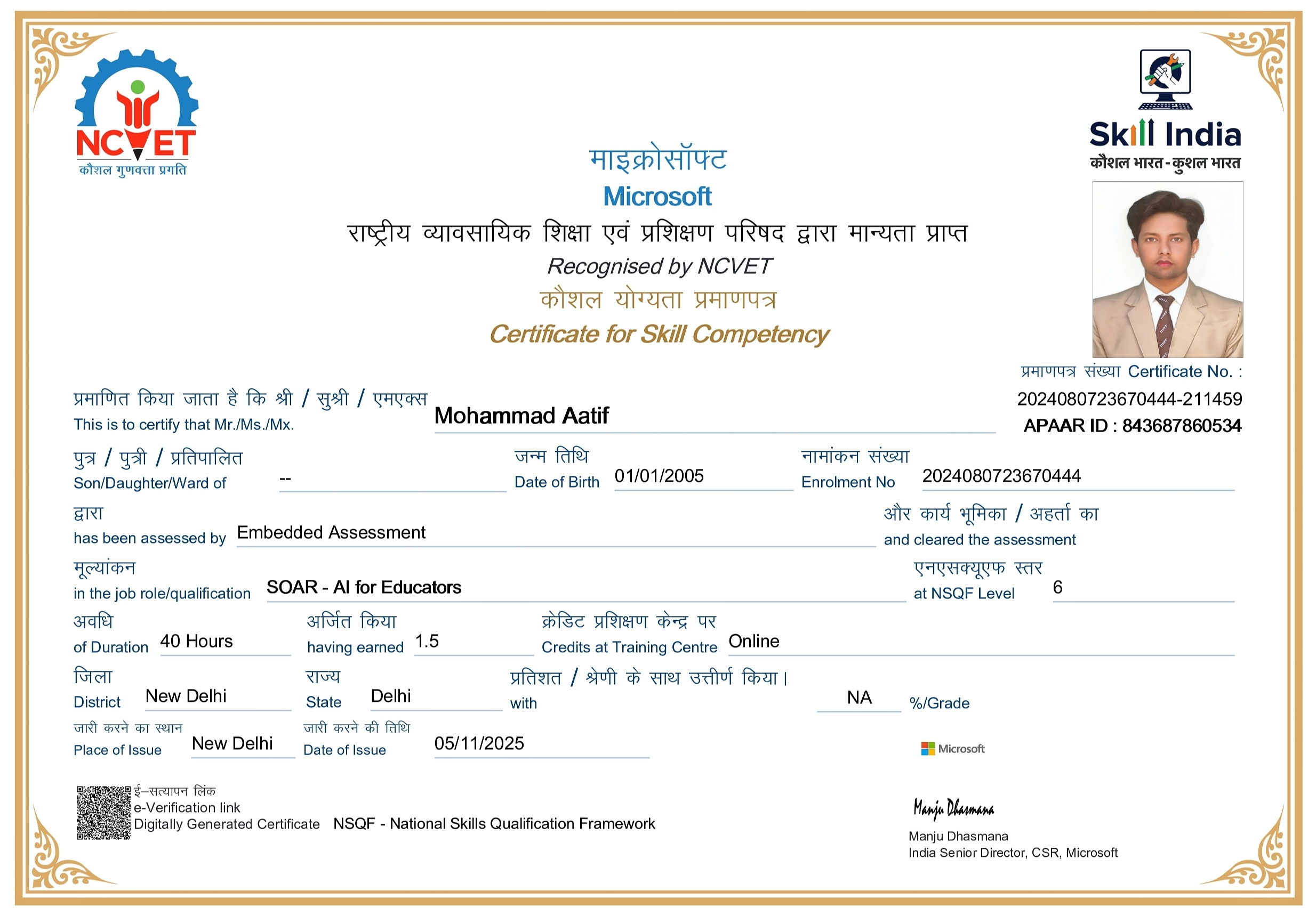 Each course was conducted and assessed online through the Skill India Digital platform, and all certificates were digitally verified and co-signed by Microsoft India and NCVET. These achievements represent my dedication to continuous upskilling and align with India's national vision of "AI for All."