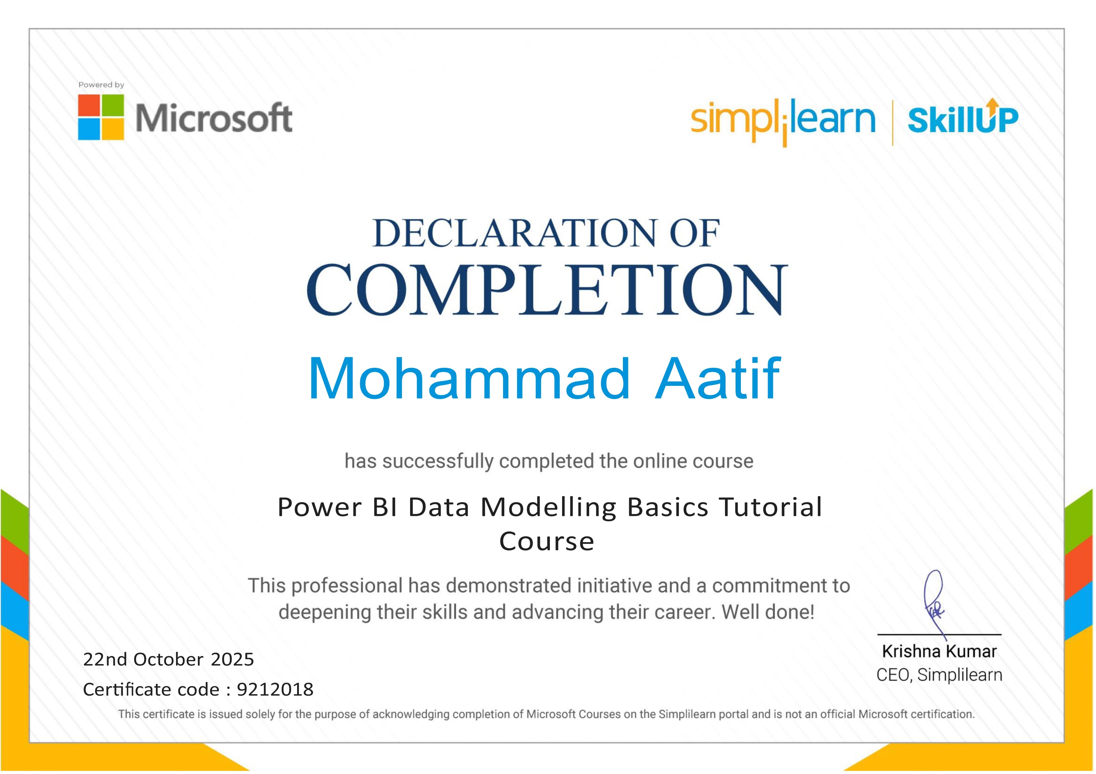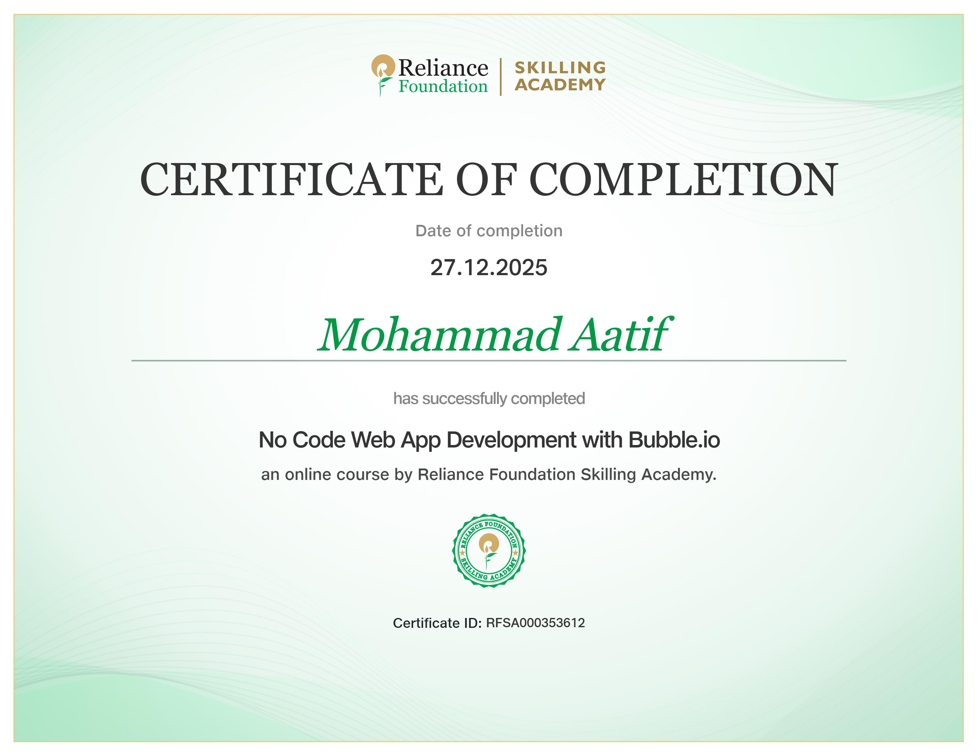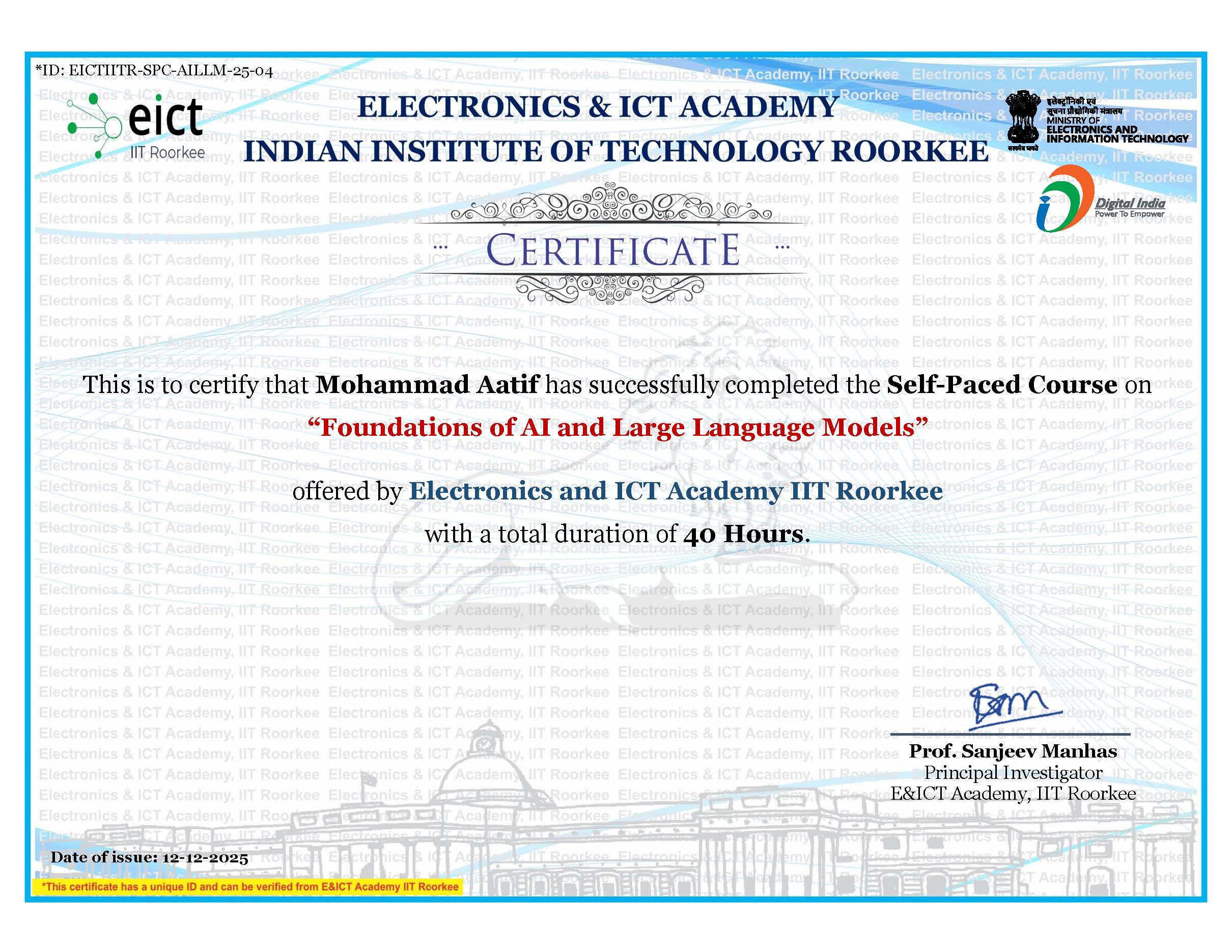 Each course was conducted and assessed online through the Skill India Digital platform, and all certificates were digitally verified and co-signed by Microsoft India and NCVET. These achievements represent my dedication to continuous upskilling and align with India's national vision of "AI for All."