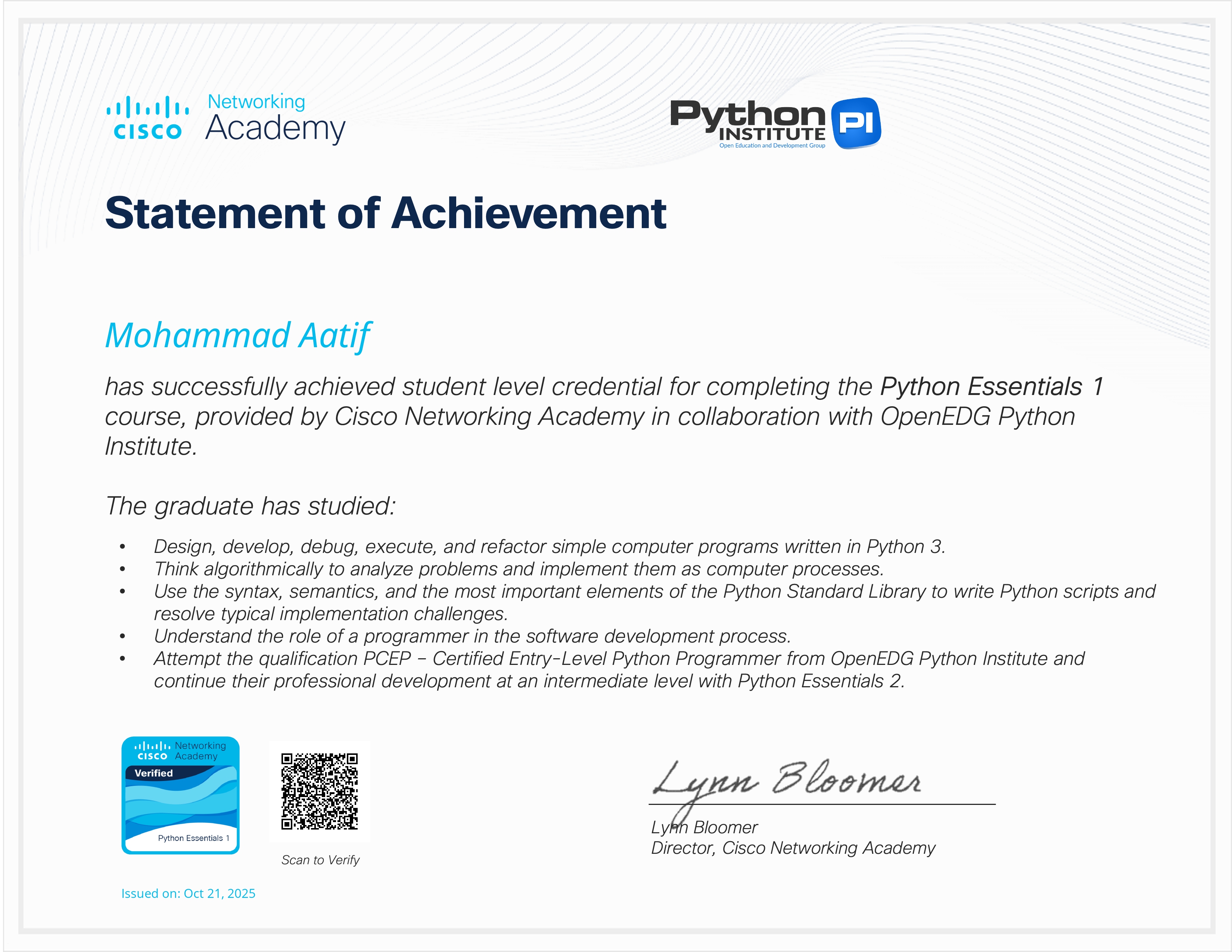 - AI to Acquire (0.5 Credit, 15 Hours) – Strengthened my applied understanding of AI through hands-on learning experiences and embedded assessments.